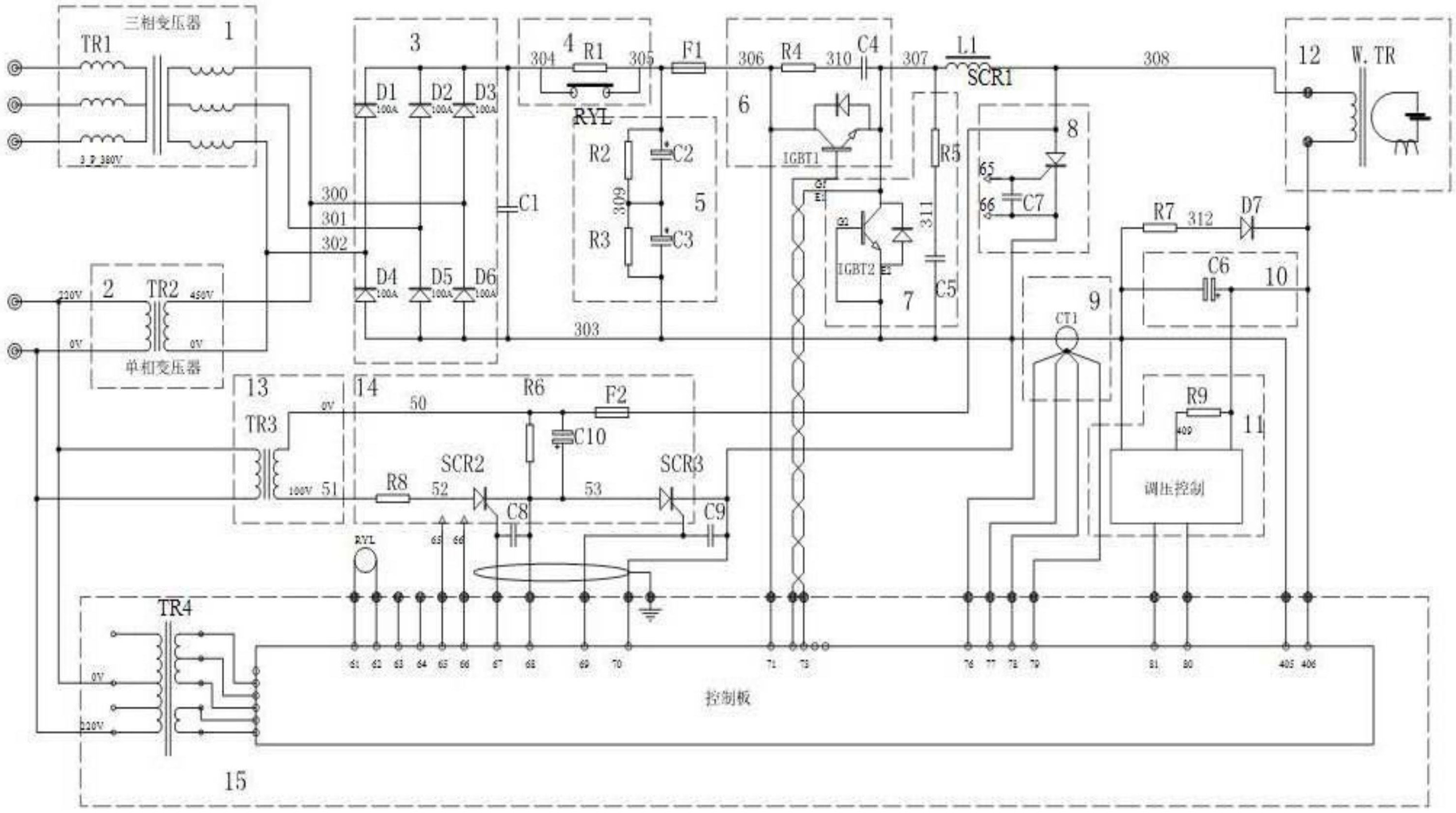 本发明涉及焊机技术领域,尤其是PWM脉宽式恒流充电式电容储能焊充电控制系统,它包括三相充电变压器、单相充电变压器、整流回路、DC_LINK滤波回路、PWM充电控制部分、充电电流检测部分、焊接变压器、放电回路、放电关断电路、放电电流检测部分、放电控制部分和电容器组;无论输入电源是单相或者三相,均可以用同一控制器进行控制,采用PWM脉宽调制方式,比SCR调节方式精度提高10倍以上(以1000HZ而计),采用霍尔电流传感器,实时采样充电电流,利用它调整PWM脉冲宽度,从而实现恒流控制;充放电都利用焊接变压器,充电电流方向和放电电流方向两者相反,这样可以有效防止变压器磁化。