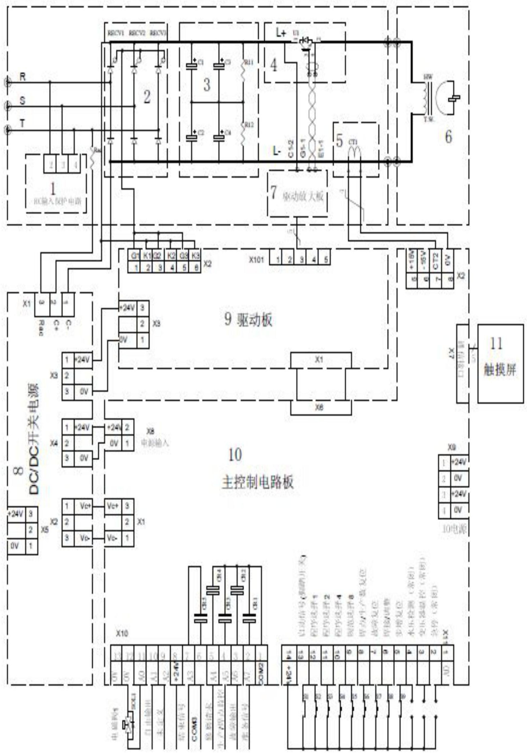 本产品涉及焊机技术领域,尤其是一种新型脉冲直流焊接电源,它包括RC三相输入防浪涌保护电路、三相半控整流桥、DC_LINK滤波储能回路、IGBT放电控制电路、放电电流检测板、焊接变压器、IGBT驱动放大回路、DC?DC开关电源电路、IGBT驱动电路及半控桥可控硅控制板、主控制板和触摸屏,实现闭环控制,保证焊接电流的设定值、实际值和反馈值三者一致,采用IGBT,由于IGBT的特性决定,只要在IGBT的G和E控制端,加入?8V左右的负电压,IGBT就可以可靠的关断;本发明的电容器组只是作为DC?LINK支撑作用,除非输入功率严重不足的情况才补偿到放电变压器中,故基本没有能量损失。